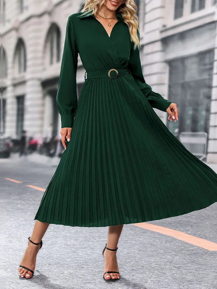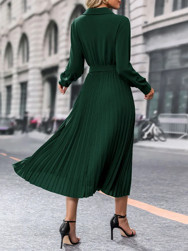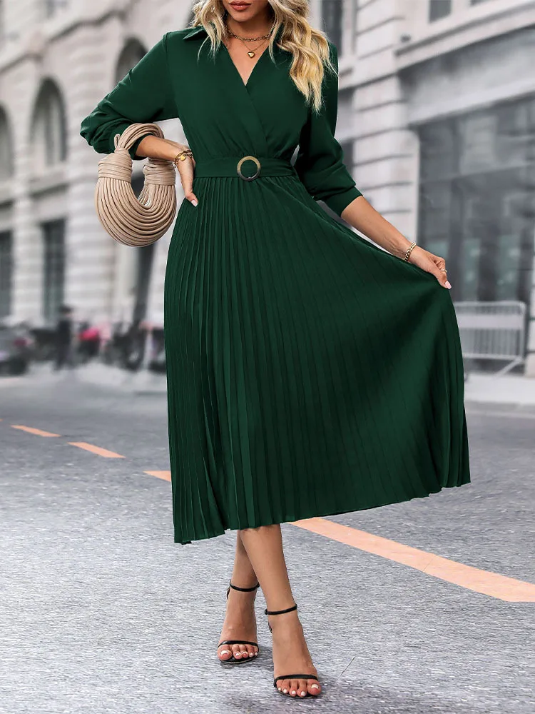 Dress Long Dresses Women Turn Down Collar Full Sleeve Pleated Elegant Splice Tight Waist Vestidos A Line Temperament Autumn