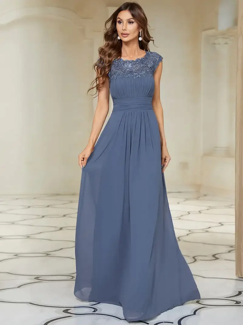 Elegant floor length chiffon evening dress with lacey cap sleeves. Delicate lace and rhinestones decorate the neckline while the ruching in the bust and waist creates a figure-flattering silhouette. This evening dress is perfect for an evening party, cocktail, prom, homecoming, graduation, weddings, and any other formal affair!