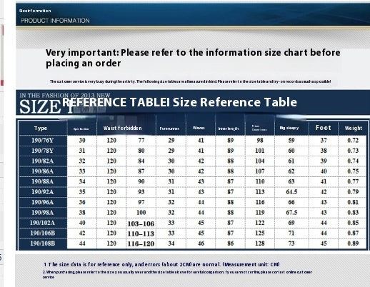 Size: No. 29 2 feet 2 waist, no. 30 2 feet 3 waist, no. 31 2 feet 4 waist, no. 32 2 feet 5 waist, no. 33 2 feet 6 waist, no. 34 2 feet 7 waist, no. 35 2 feet 8 waist, 36 2 feet 9 waist, 38 3 feet, 40 3 feet 1 to 3 feet 2 waist, 42, 3 feet 3 to 3 feet 4 waist, 44, 3 feet 4 to 3 feet 6 waist, 46,3 feet 7 to 3 feet 8 waist