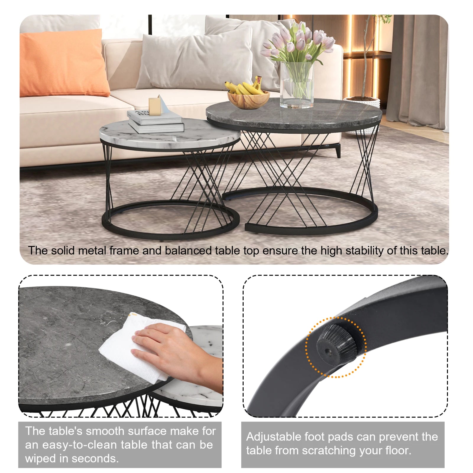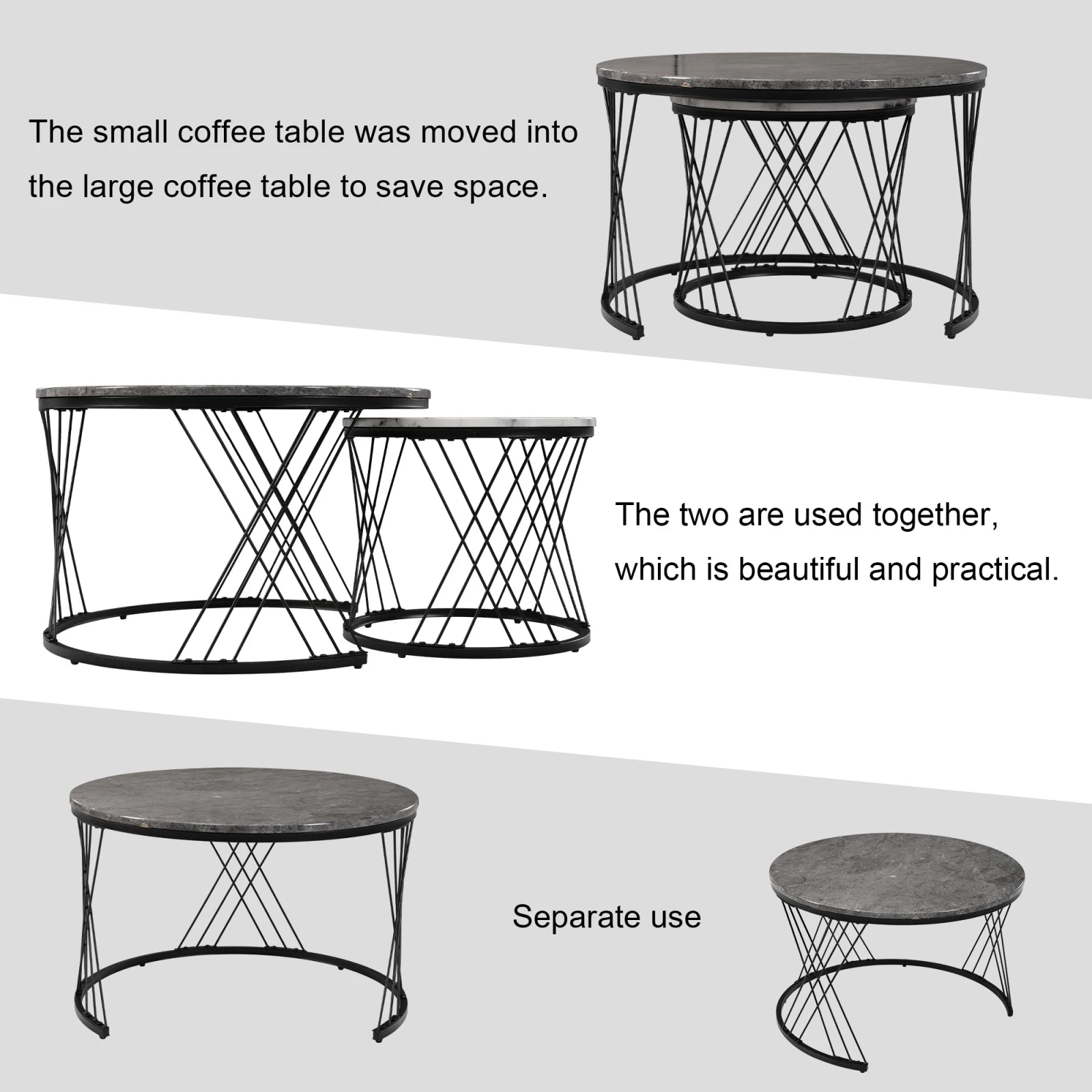 Nesting Round Coffee Table,2pcs Modern Tea Table,Marble Pattern Top With Metal Frame, Small Side Table,End Table For Living Room
