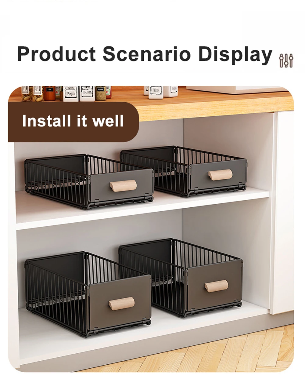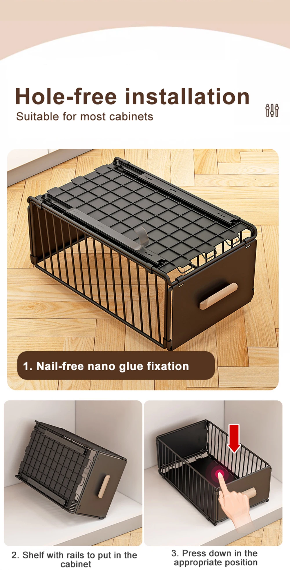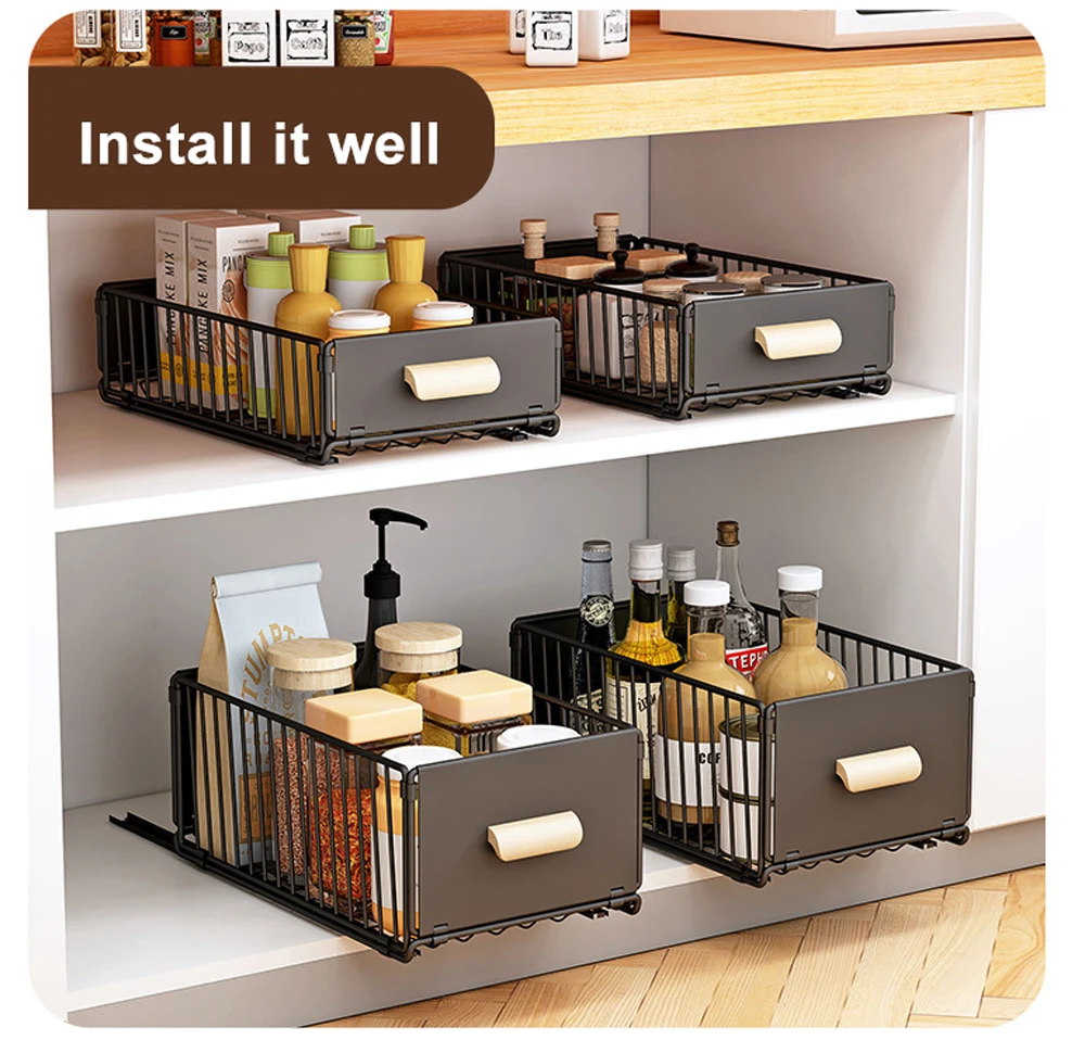 NO NEED DRILL & NAIL: The kitchen cabinet organizers and storage , easy to install, no need to drill & nail and just following manual, you could finish the installation in 10S. Perfect for your kitchen, bathroom, under sink and pantry storage organizing.
