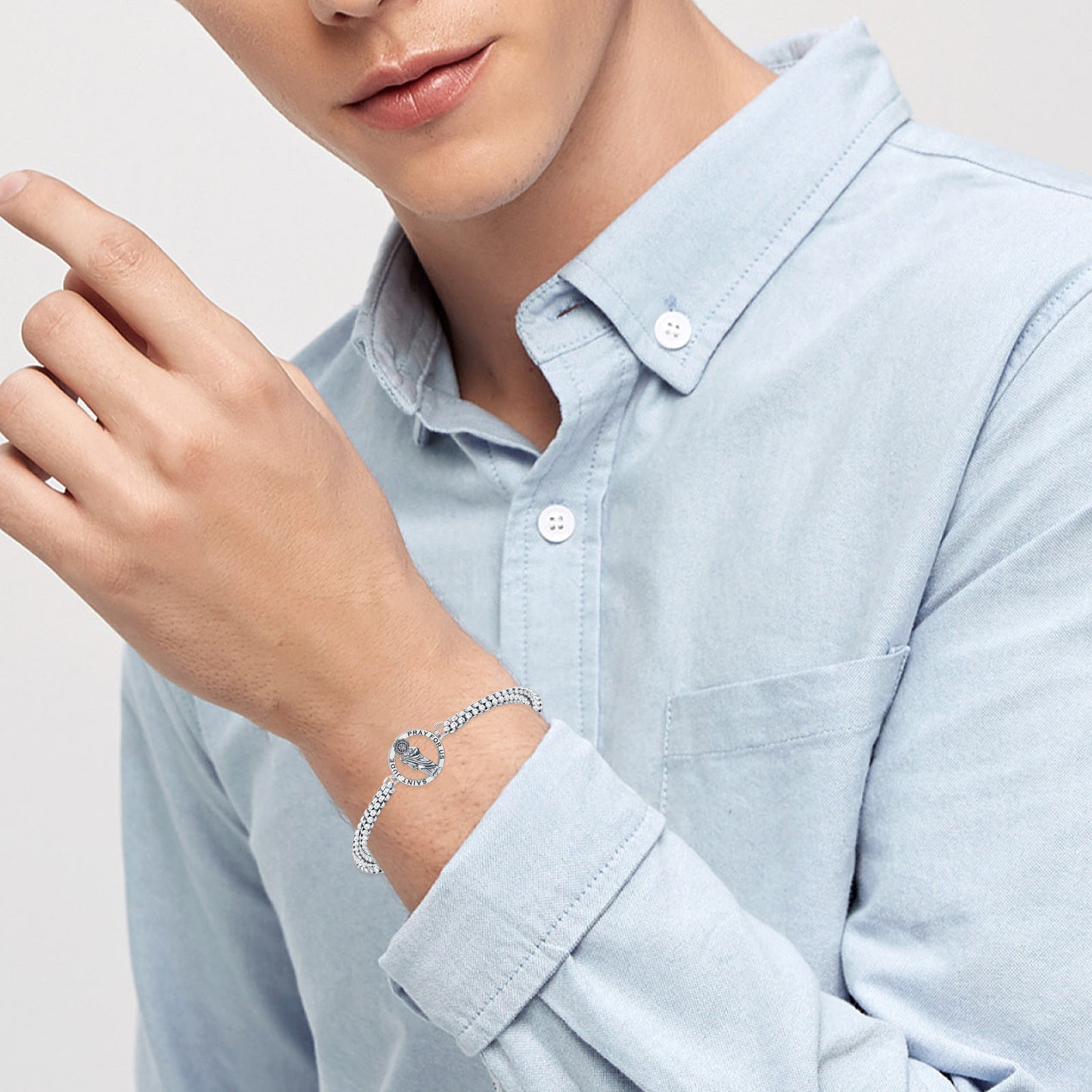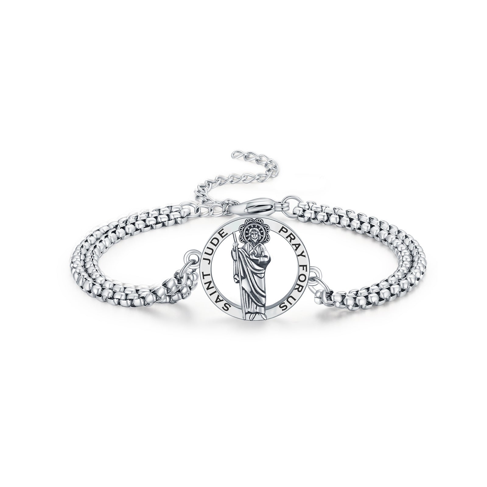 SAINT JUDE BRACELET FOR MEN AND WOMEN -- Saint Jude bracelet is designed for both of men and women,it features Saint Jude charm setting on a stainless steel link chain. classic and delicate look could be wear alone or layered with other bracelet that you have already own to pack a huge style punch.