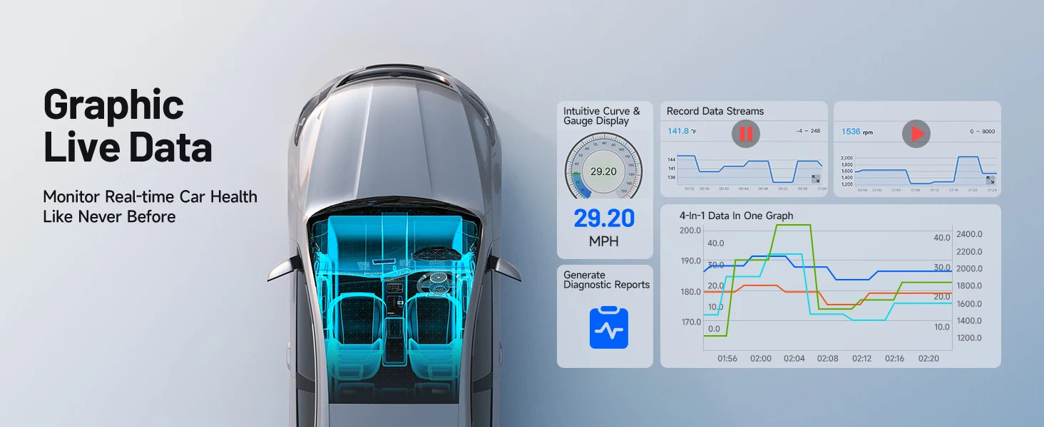 ·Live Data Graphic: Visualize the real-time data in graphs or gauge displays for immediate understanding of the car’s operating status.