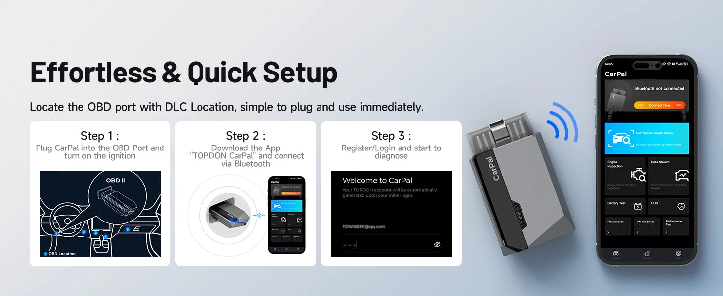 ·DLC Location: Select vehicle make, model and year to get a picture of DLC location, easily access to the OBD port and connect the CarPal for quick diagnosis.