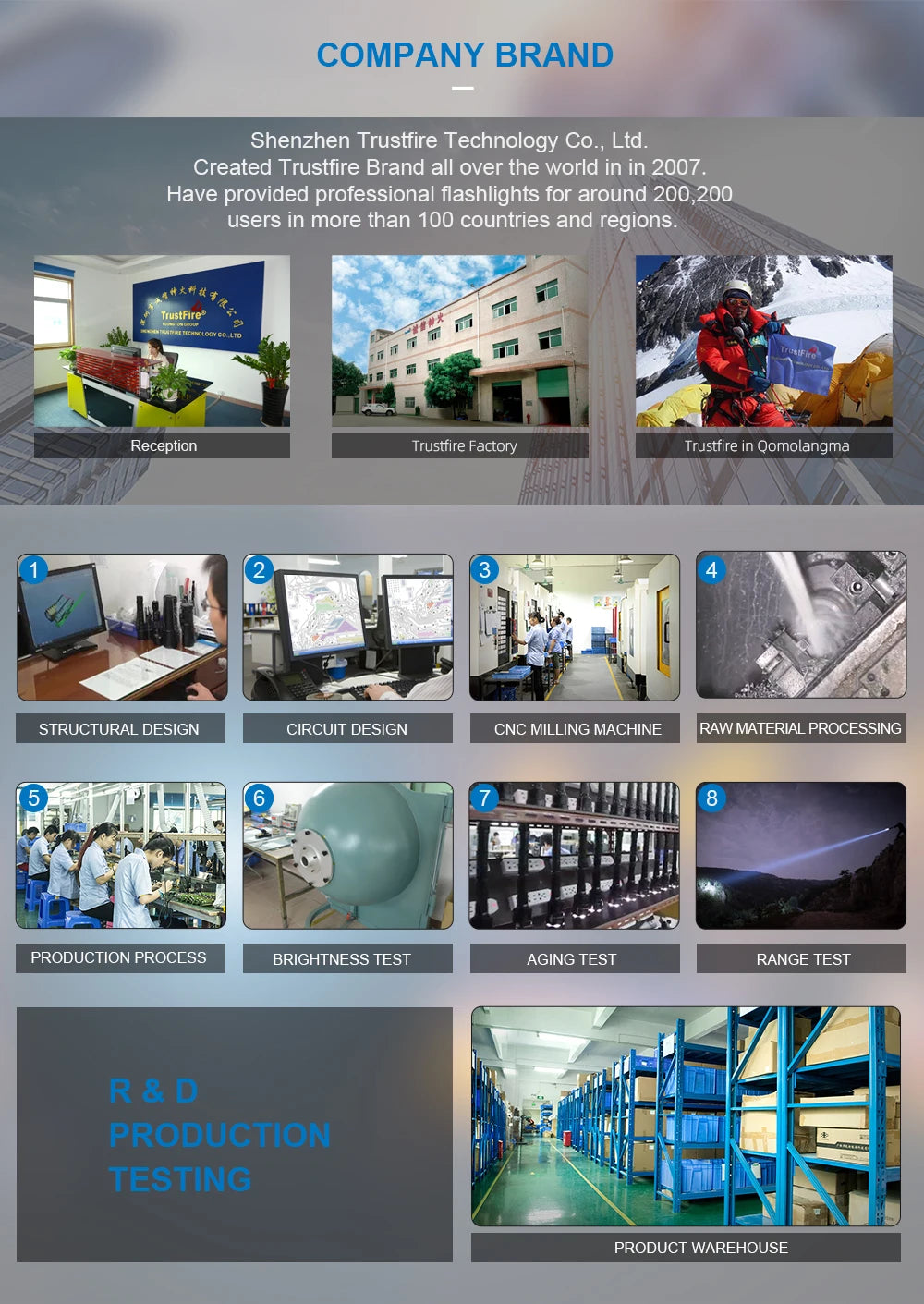 Shenzhen Trustfire Technology Co., Ltd. Created Trustfire Brand all over the world in in 2007. Have provided professional flashlights for around 2,000,200 users in more than 100 countries and regions.